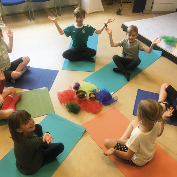 Wir begeben uns auf fantasievolle Reisen, dort begegnen uns verschiedene Landschaften, Gestalten und Tiere, die uns dann in unseren Yogaübungen begleiten. Wir stehen wie ein Baum, brüllen wie ein Löwe und fliegen wie ein Schmetterling. Wir entspannen uns mit kurzen Atemübungen und Fantasiereisen. Anschließend verarbeiten wir das Gelernte in fantasievollen Bildern, Tonarbeiten oder mit Naturmaterialien.